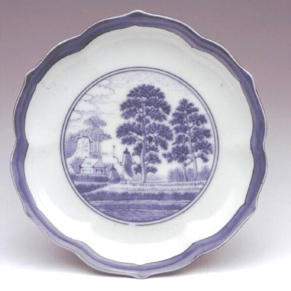 Het schaaltje is gewelfd en heeft een standring en een geaccoleerde rand met lip. Het plat heeft, binnen een dubbele cirkel, een decor van een Hollands landschap met wolken, een rots, een huis, bomen en twee Hollandse reizigers met hoed. Langs de rand loopt een blauwe band. Het schaaltje is qua vorm en decoratie een navolging van Delfts aardewerk vervaardigd door plateelschilder Frederik van Frijtom. (Nederlands)