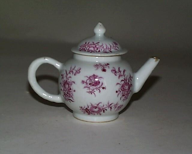 porselein, decoratie in famille rose-techniek in Lowestoft-stijl in lila, restanten van bovenglazuur goud (Nederlands)