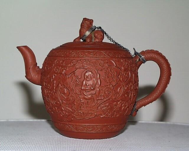 De Yixing theepot is bolvormig en heeft een verzonken bodem. De sterk omgebogen tuit ontspruit uit een slangen- of drakenmuil. Het oor heeft de vorm van een drakenstaart. Het gewelfde deksel is gedecoreerd met bladmotieven in reliëf, en heeft een knop in de vorm van een boeddhistische leeuw. De buik van de theepot is in reliëf gedecoreerd met boven de standring en langs de rand banden met rankwerk, waartussen een brede band met ranken, pioenrozen en aan weerszijden een naakte jongen die ranken ophoudt. (Nederlands)