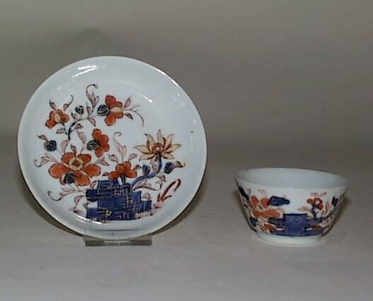 Dun porselein. Chinees Imari. Decor blauw onderglazuur, ijzerrood en goud opglazuur (rots of muur met bloeiende planten) (Nederlands)