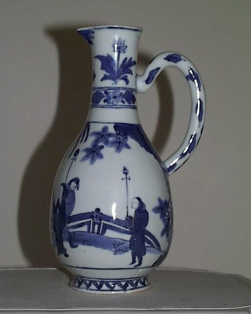 Decor blauw onderglazuur (figurale voorstelling in tuin, bladmotieven langs de hals, navolging Chinees kannetje). (Nederlands)