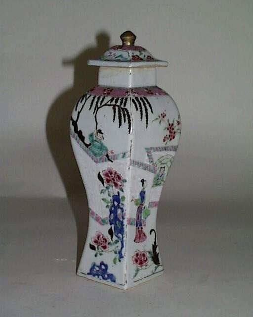 De vierkante vaas is balustervormig en heeft een vlakke bodem, een rechte hals en een vierkant, wijd klokvormig deksel met een dubbelconische knop bodem. De buik heeft een decor van een over een muur bij een treurwilg, rotsen en prunus klimmende man, een decor van een dame met waaier, een zogenoemde 'lange Lijs', wandelend in een tuin met prunus en op de achtergrond een zittende man, een decor van een staande dame in een tuin met prunus en een rots waarop een wierookbrander bij een huis, en een decor van een staande dame in een tuin met een rots en prunus bij een huis met een knielende man die een brief aanbiedt. Op de schouder loopt een band met swastikavormig servetwerk waarin zich bloemen bevinden. Het deksel heeft vier trapeziumvormige panelen met afwisselend bloementakken en gestileerde landschapsdecors. Rond de knop loopt een vierkante band met swastikavormig servetwerk waarin zich bloemen bevinden. Deze decors zijn scènes uit 'de romance van de westelijke kamer', waarin een jonge man, Zhang, teneinde niet van zijn studie tot ambtenaar te worden afgeleid, zich in een klooster heeft teruggetrokken. Op een dag verblijft in of bij het klooster een jonge vrouw, die daar samen ... (Nederlands)