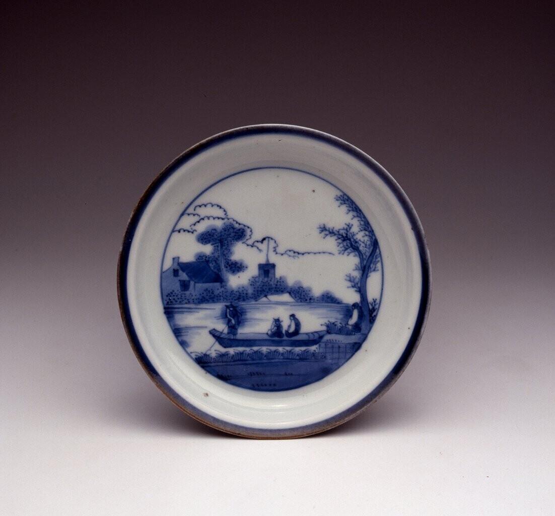 Het schaaltje is gewelfd en heeft een rechte standring en een rand met lip. Het plat heeft, binnen een enkele cirkel, een decor van een Hollands rivierlandschap met wolken, huizen, een kerktoren, bomen, een op de oever gezeten man en een bootje met drie Hollandse figuren waarvan twee met hoed. Langs de rand loopt een blauwe band. Het schaaltje is qua vorm en decoratie een navolging van Delfts aardewerk vervaardigd door plateelschilder Frederik van Frijtom. (Nederlands)