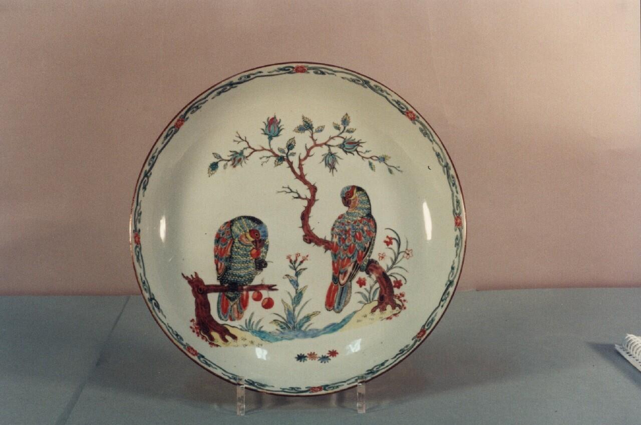 Uit China afkomstige en in Delft beschilderde porseleinen schotel met een voorstelling van twee papegaaien. De voorstelling is gebaseerd op een gravure 'twee papegaaien in een landschap' van Adriaen Colleart, de tweede uit de serie Avivm Vivae uit 1580. De linker papegaai is vrijwel ongewijzigd overgenomen. De rechter papegaai is gespiegeld en op een tak naar Japanse stijl neergezet. (Nederlands)