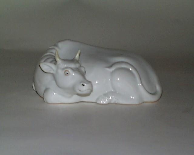Ongedecoreerd porseleinen beeld vermoedelijk van een karbouw (Aziatische waterbuffel). Ogen licht ijzerrood en donkerblauw afgewerkt. (Nederlands)