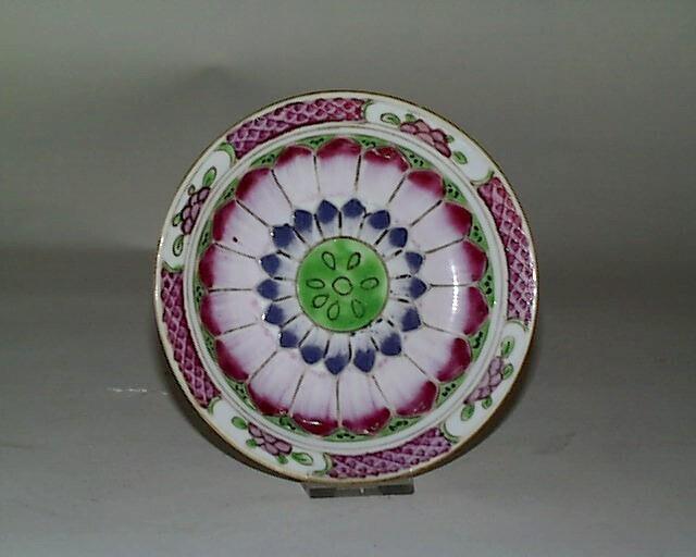 decor in verschillende kleuren (o.a. emaillen), opglazuur (van centrum tot rand) zeventienbladige, bloemachtige rozet; rand in 8 vakken afwisselend bloemmotief; schubbendecor. (Nederlands)
