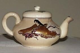De theepot heeft een standring. De gedrukt ellipsoïdische theepot heeft een ovaal oor, een flauw gebogen tuit en een gewelfd deksel met platte ronde knop. De buik heeft aan de ene zijde een decor van een zittende dame, vermoedelijk een actrice, en aan de andere zijde een Japanse tekst. Het deksel heeft een decor van twee hartvormige bladeren. (Nederlands)