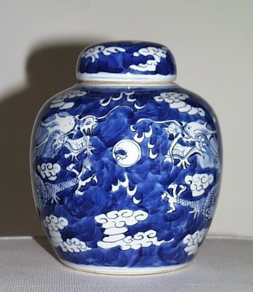 De gemberpot is gedrukt canopisch van vorm en heeft een standring, een korte conische hals en een gedrukt half bolvormig deksel. De buik heeft een grotendeels in het blauw uitgespaard decor van gestileerde wolken en vlammen, en twee vierklauwige draken jagend op een vlammende parel. Het deksel is gedecoreerd met gestileerde wolken en vlammen. (Nederlands)