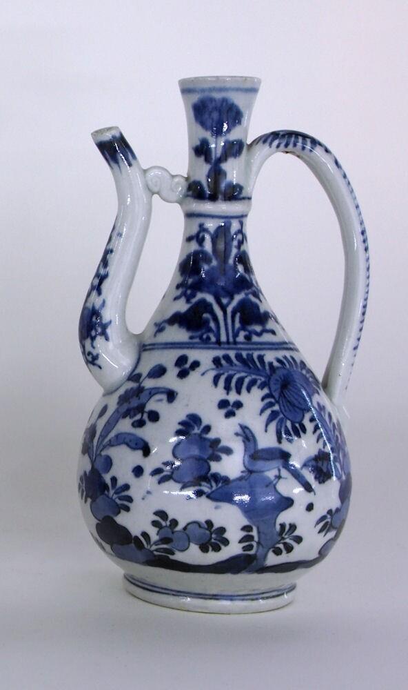 De schenkkan is peervormig en heeft een korte concaaf-conische voet, een smalle concave hals met halverwege een verdikking, een boogvormig oor en een flauw S-vormig gebogen tuit met een S-vormige brug naar de hals. De buik heeft aan beide zijden een decor van een landschap met rotsen, bloeiende planten en een vogel op een rots. De hals is onder de verdikking gedecoreerd met bloemen met rankwerk en erboven met bloemen. Het oor is versierd met rankwerk. De tuit heeft een decor van een bloem met rankwerk. (Nederlands)