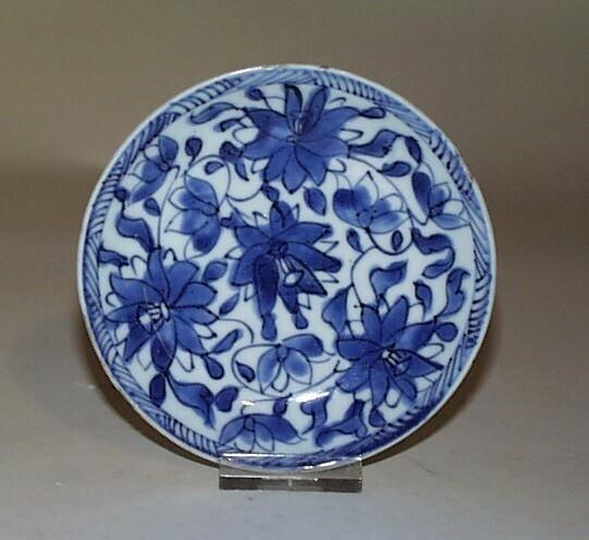 decor blauw onderglazuur van bloemen, gehele voorkant bedekkend, behalve ornamentale lijn-rand (Nederlands)