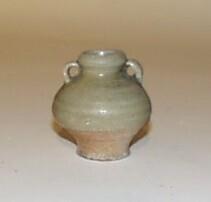 Het vaasje is bolvormig en heeft een ingesnoerde hals, staande oren, een concave voet en een vlakke bodem. (Nederlands)
