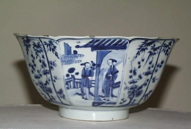 De octagonale kom is omgekeerd klokvormig en heeft een standring en een geaccoleerde rand. Het plat heeft een centraal decor binnen een dubbele cirkel van bamboe en bloeiende prunus. Langs de rand loopt een band met alternerend gearceerd driehoekig servetwerk. De buitenwand heeft afwisselende decors van twee oosterse dames bij een prieel met een hekje onder gestileerde wolken, en bamboe met bloeiende prunus. (Nederlands)