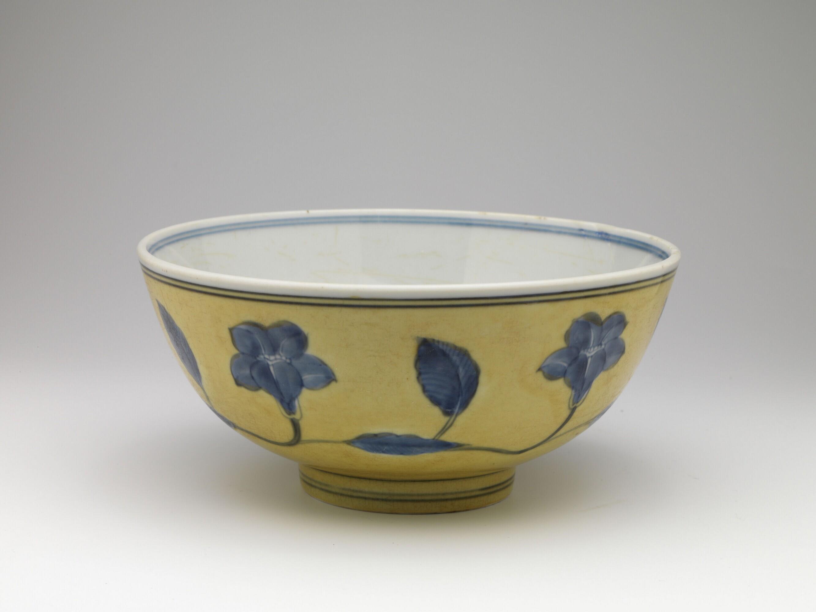 decor bloemen- en bladerenrand in blauw onderglazuur op fond van geel glazuur, van binnen cirkelvulling met blauw bladeren-decor (Nederlands)