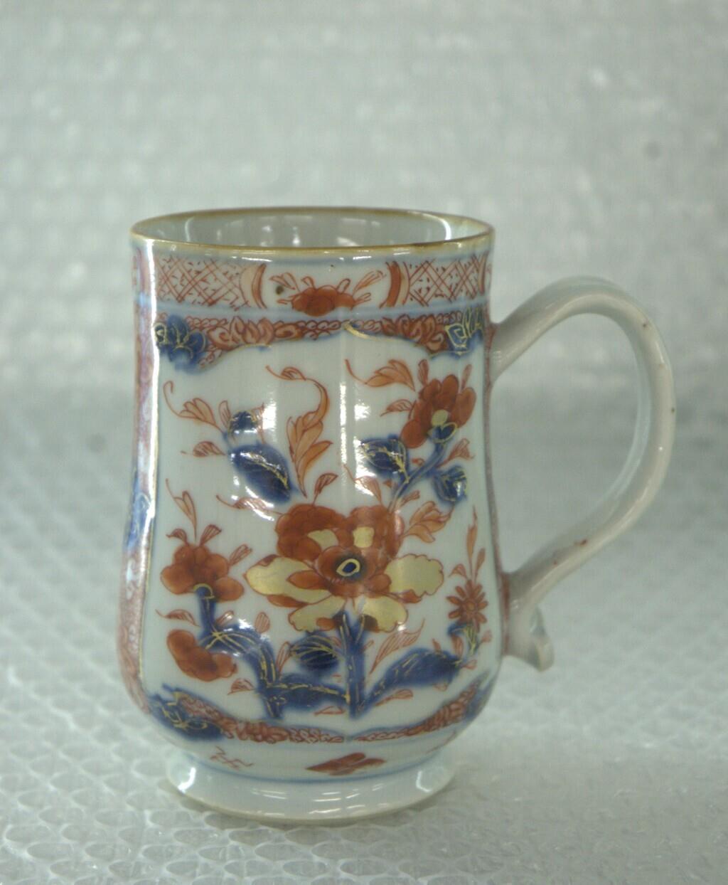 De beker is buidelvormig en heeft een conische voet en een lusvormig oor met een ru-yi-kopvormige onderkant. Boven de voet loopt een band met ruit- en swastikavormige versieringen. De buik is gedecoreerd met servetwerk waartussen lotusranken, en twee geschulpte kaders waarin bloeiende planten. Langs de rand loopt een band met swastikavormig servetwerk waartussen ovale cartouches met bloemen. Het oor is gedecoreerd met een bloemenrank, en aan de onderkant met een ru-yi-kop in onderglazuur blauw en bovenglazuur goud. (Nederlands)