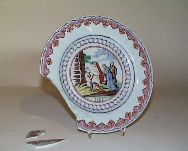 bijbelse voorstelling van het boek van Job, hoofdstuk 2, decor polychroom, ijzerrood email, zwart opglazuur, in cirkelvormige omlijsting, gekruld randdecor (Nederlands)