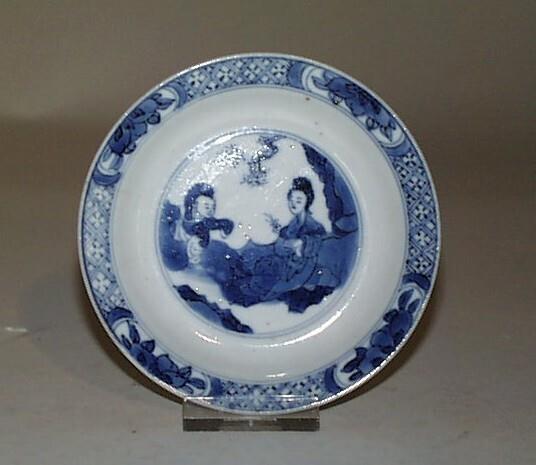 Het schoteltje heeft een smalle, schuin oplopende rand en een standring. Het plat heeft, binnen een dubbele cirkel, een decor van rotsen, een op een boom gezeten vrouw met een bloesemtakje, een zogenoemde 'lange Lijs', en een spelend kind, een zogenoemd 'zotje'. De rand is versierd met afwisselend bloemvormig servetwerk en ovale cartouches met bloemen. De buitenwand is gedecoreerd met vier kostbaarheden. (Nederlands)