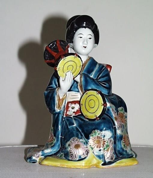 De sculptuur verbeeldt een geknield zittende muzikante met een trommel op de schoot en een trommel op de rechter schouder. Ze heeft opgestoken haar en draagt een kimono met chrysanten op de mouwen en langs de zoom, waaromheen een ceintuur, een zogenoemde obi, met een prunusdecor. Uit het feit dat de dame de strik op de rug draagt, kan worden opgemaakt dat zij geen geisha of courtisane is. (Nederlands)