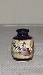 Het gedrukt bolvormige miniatuurvaasje heeft een standring en een korte hals, een zwarte band boven de standring en een zwarte schouder en hals, met daartussen een decor van een dame gezeten in een landschap met bloemen. (Nederlands)