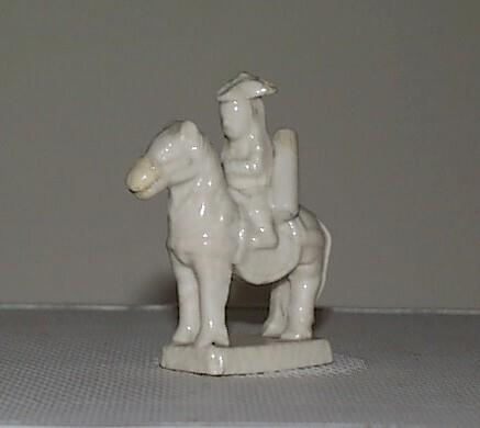 Beeldje van een man met koker op de rug, driekantige hoed en te paard. (Nederlands)