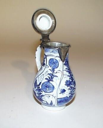 Het kannetje is peervormig en heeft een standring, een driehoekige sneb, een gegolfd oor, een wijd klokvormig deksel en een zilveren montering met scharnier rond monding, sneb en dekselrand en een vatting rond het oor. De buik heeft gedraaide cartouches met decors van bloeiende planten met insecten. De rand is gedecoreerd met servetwerk van gearceerde driehoeken. Het oor heeft een decor van een bloemenrank. Het deksel is versierd met bloeiende planten. (Nederlands)