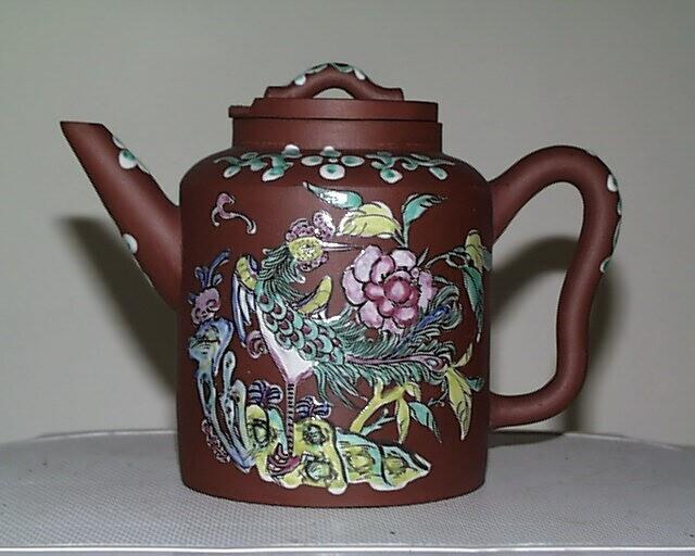 Cilindrische theepot, met decor van polychroom opgekleurd wit email van vogel bij struik met bloem, bloesemtak en gebloemde takjes. (Nederlands)