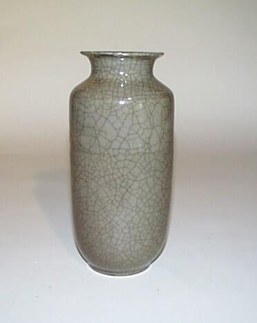 Porselein gegelazuurd met een vet gecraqueleerd beigekleurig glazuur. Er is nog weinig onderzoek naar dit type porselein gedaan, maar hoogstwaarschijnlijk werden deze objecten gemaakt voor de Europese export. Het ontwerp verwijst naar vroegere periodes zoals de Ming en Qing, wat erg populair was aan het einde van de negentiende en begin van de twintigste eeuw. (Nederlands)