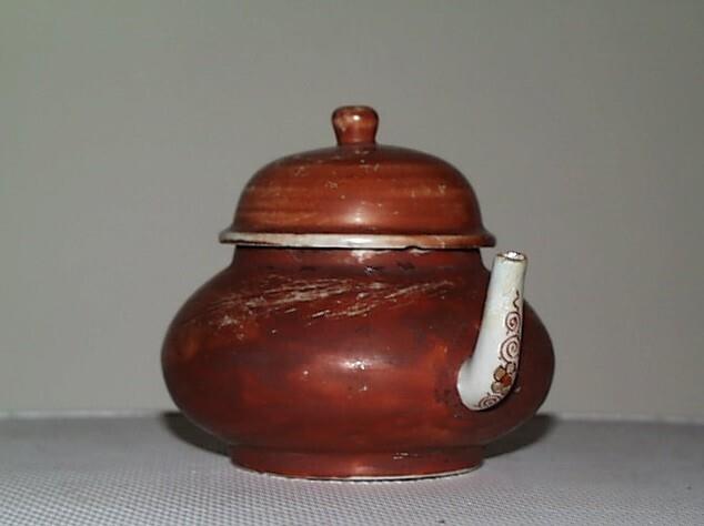 Theepot van porselein. Op tuit en oor na, van buiten geheel bedekt met ijzerrood emaille. Tuit en oor zijn versierd met een gekruld ornament in ijzerrood en goud opglazuur. Ook dit decor kan herkend worden als 'Amsterdams bont'. Porselein dat werd aangevoerd uit China werd vaak in Nederland verder gedecoreerd. Zelfs het overschilderen van onderglazuur blauwe decoraties werd hierbij niet geschuwd. De rode en gouden ornamenten op de tuit zijn van de hand van een Europeaan. Daarbij doet het geheel overschilderen van de theepot met een rood-bruine emaille denken aan het rode steengoed dat uit Yixing kwam en erg populair was bij de Nederlandse bevolking in de achttiende eeuw. (Nederlands)