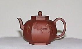 Theepot, zeskantig, met een decor van gebloemde takjes in reliëf. (Nederlands)