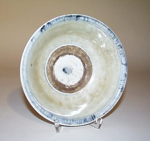 Porselein of porseleinachtig steengoed met blauw decor onderglazuur. Glazuurloze dofbruine ring in spiegel. (Nederlands)