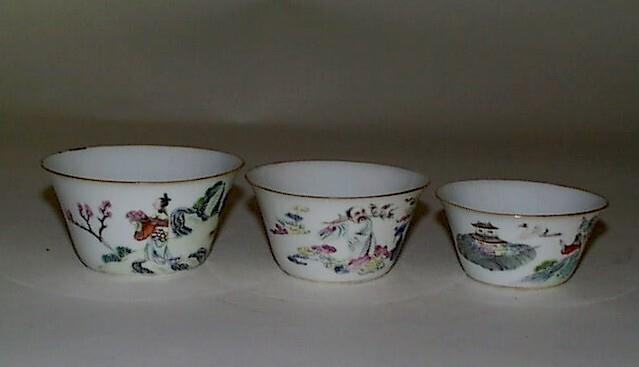 Nest met kommen. Decor polychroom (vnl. emails) opglazuur. Verschillende figurale voorstellingen, vruchten, blaadjes enz. Randen goud gebiesd. Een stapel opeenvolgende kommen en schaaltjes wordt ook wel een 'nest' genoemd. (Nederlands)