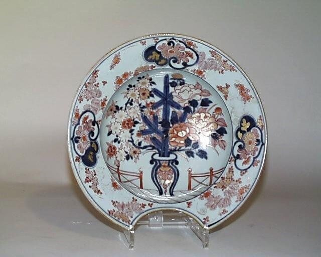 Het scheerbekken is aan de achterkant voorzien van een standring en heeft twee gaatjes in de brede rand. Aan de voorkant is het plat versierd met een vaas gevuld met pijnboomtakken, pioenrozen en andere bloemen. De vaas staat op een veranda met een hekje. Op de rand zijn ruyivormige cartouches met chrysanten afgebeeld, gescheiden door prunus. (Nederlands)