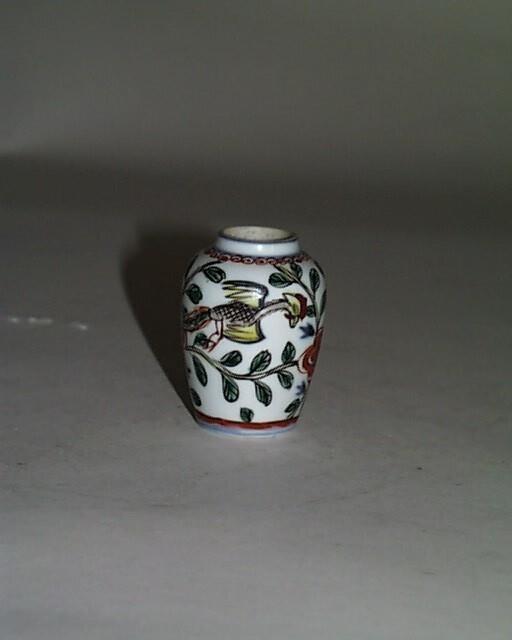 Potvormig. Decor blauw onderglazuur en polychroom opglazuur, bloemen en vogels. (Nederlands)