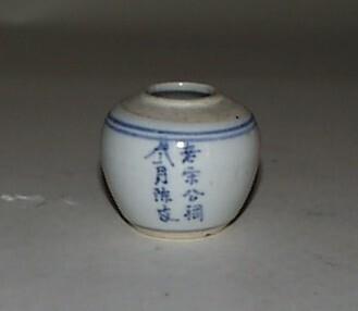 Bovengedeelte ongeglazuurd. Met biesjes en 2 opschriften in Chinese karakters. Blauw onderglazuur. (Nederlands)