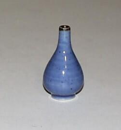 Enigzins flesvormig. Geheel met poederblauw onderglazuur. Bruin geglazuurd halsrandje. (Nederlands)
