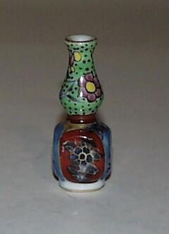 Het miniatuurvaasje is kalebasvormig en heeft een rechte, vierkant afgeplatte buik en een gewelfde bodem. Op de buik bevinden zich vier cartouches met blauwe onderglazuurfloraaldecors met bovenglazuur goud en ijzerrood tegen een afwisselend blauwe en rode achtergrond. De hals is groen met zwarte stippen, waarop zich bloemen in hetzij ijzerrood met goud, hetzij geel met paars, alsmede blauw onderglazuurrankwerk bevinden. (Nederlands)