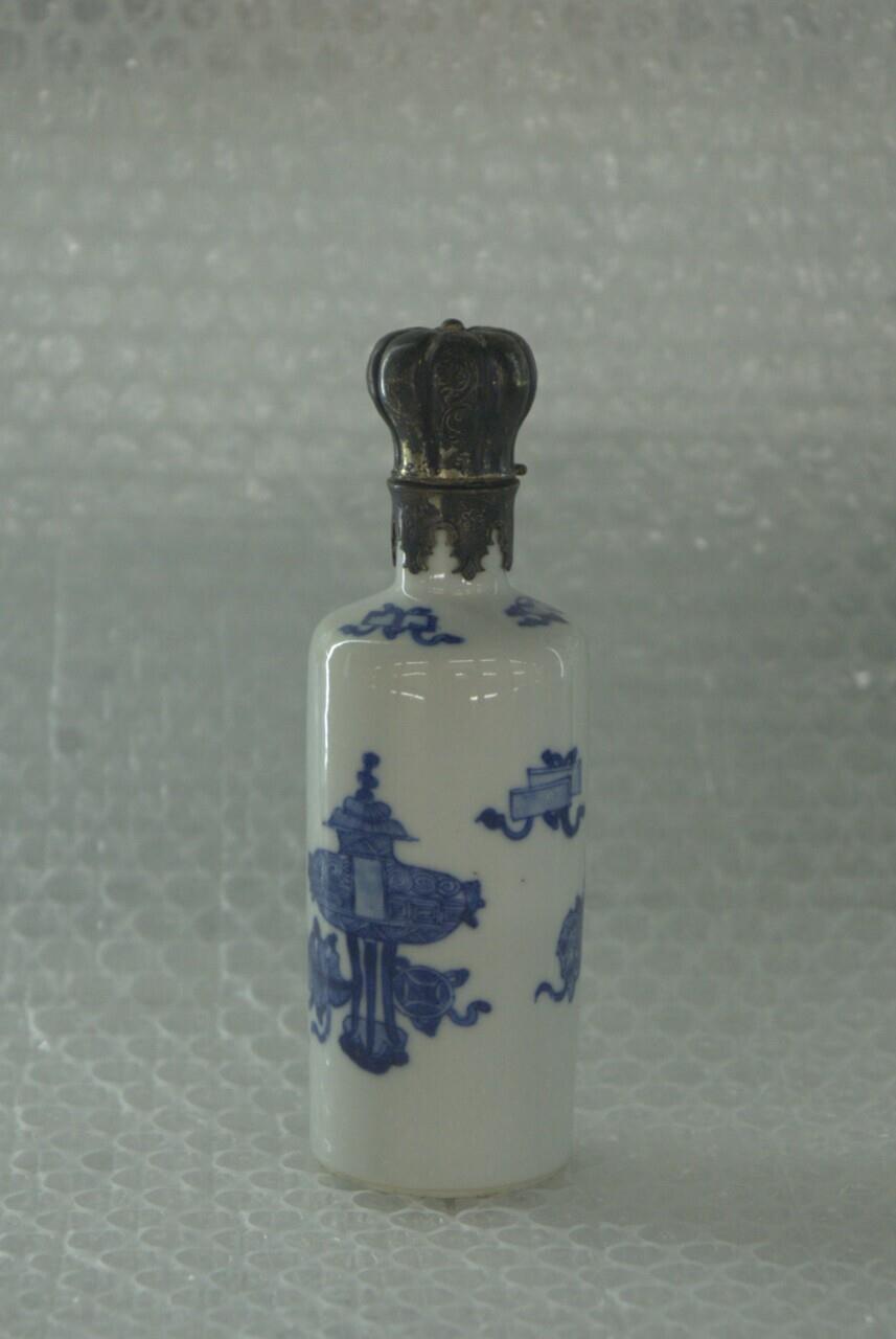 Het porseleinen vaasje met standring is afkomstig uit China en is cilindrisch van vorm. Om de nek is een Indonesisch zilveren halsmontering met scharnierend uivormig deksel. Hieronder bevindt zich een kurkje met zilveren knop. Het vaasje is op de buik en schouder in onderglazuur blauw gedecoreerd met het decor van de '100 kostbaarheden' . (Nederlands)