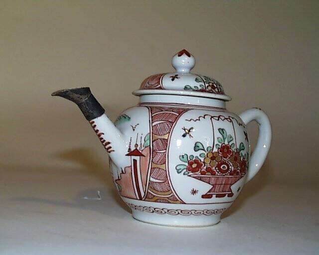 Bolvormige theepot met rechte tuit, een ovaal oor, een standring en een wijd klokvormig dekseltje met knop. Het decor bestaat uit afwisselend grote en kleine ovale cartouches, waartussen zich bladmotieven bevinden. De kleine cartouches hebben een decor van een rivierlandschap met een huis, een boom, vogels en een visser. In de grote cartouches is een bloemenmand geschilderd. Dit type decor noemen we Amsterdams bont. Wit of gedeeltelijk met onderglazuur blauw gedecoreerd porselein dat door de VOC uit China werd ingevoerd, kon in Nederland met rood, groen en goud verfraaid worden. Onderwerpen zoals de bloemenmand en architectuur waren populair in Nederland en komen hierdoor veelvuldig voor bij dit type porselein. (Nederlands)