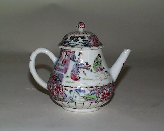 porselein (gedrukt) ; decoratie in famille rose-techniek in groen, roze, rood, blauw, lila en zwart (Nederlands)