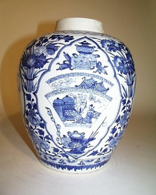 De vaas is breed canopische van vorm en heeft een conische hals, een standring en een niet-bijbehorend gewelfd deksel. Op de buik bevinden zich decors van samengebonden boeketten boven bloemenranken, afgewisseld met lotusvormige cartouches waarin van onder naar boven: een vaas met lampionnen op staken, een waaiervormige cartouche met servetwerk langs de onder- en bovenrand en een decor van twee koepelvormige gebouwtjes met hekjes, een bloeiende plant en een staande man, een deels zichtbare waaiervormige cartouche met servetwerk langs de onder- en bovenrand en een decor van een bloeiende plant en twee daken, en diverse kostbaarheden. Boven de voet loopt een band met een gestileerd patroon van golven, waarboven zich een band met afwisselend bloemen en rankwerk bevindt. De schouder is gedecoreerd met een band met ru-yi's en een band met afwisselend bloemen en rankwerk. Het deksel heeft een decor van bloemenranken. De knop is gedecoreerd met een bloem. (Nederlands)