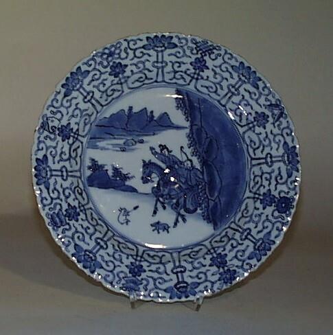 Het bord heeft een brede, licht oplopende, geschulpte rand en een standring. Het plat heeft, binnen een dubbele cirkel, een decor van een landschap met bergen, rotsen, planten en twee oosterse figuren te paard met pijl en boog, een hondje en een aangeschoten konijn, het zogenoemde 'Joosje-te-paard' decor (zie R 890-A-B). De rand is gedecoreerd met gestileerd rankwerk waaruit lotussen op afwisselend korte en lange stelen ontspringen; tussen de langstelige lotussen zijn kostbaarheden afgebeeld (zie R 378). De buitenwand is versierd met identieke bloemen. (Nederlands)