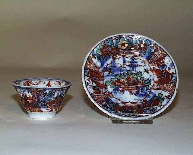 Kop en schotel met gegolfde en geschulpte randen, met blauw decor van landschap waarop polychroom decor van bloemenmandje. (Nederlands)