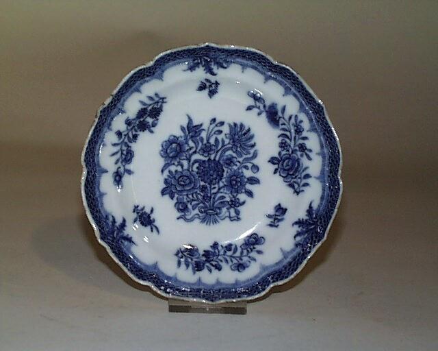 Het schoteltje heeft een schuin oplopende, geaccoleerde en licht gecontourneerde rand en een standring. Het plat heeft een centraal decor van een boeket met een strik. De wand is versierd met afwisselend bloemen en bloemenranken. Langs de rand loopt een band met schubvormig servetwerk met bladmotieven en stippen. (Nederlands)