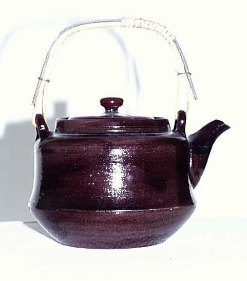 Pot met deksel. Donker rossig bruin steengoed met bruin loodglazuur en los rieten hengsel. (Engels)