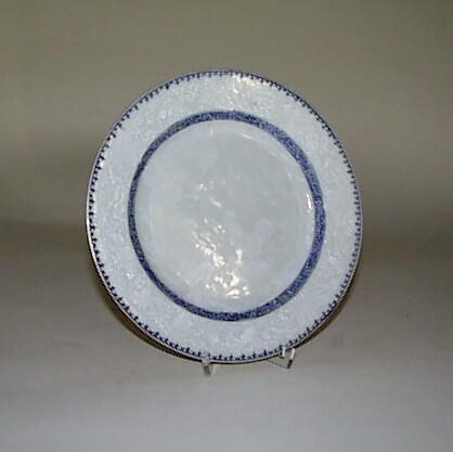 Decor lichtblauw en wit email, gouden biezen. Spiegel met haan, kip, planten en bloemen? (klopt deze beschrijving bij de foto??). Rand met gebloemde ranken. Twee ornamentale randjes in blauw. (Nederlands)