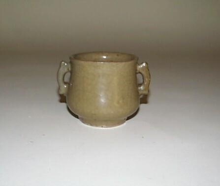 Het wierookvat is buidelvormig en heeft een standring en twee gebogen oren. (Nederlands)