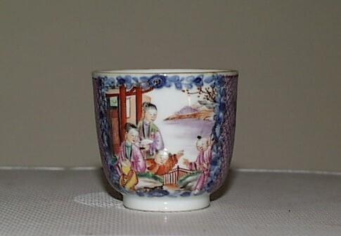 Het theekopje is convex-conisch van vorm en heeft een standring en een ovaal oor. Het kopje is aan de oorzijde gedecoreerd met ruitvormig servetwerk waarin vier bloemvormige cartouches met bloemen, en aan de andere zijde met een met bloemen omgeven zogenoemd mandarijnendecor met twee oosterse dames en twee spelende kinderen bij een prieel met een hekje aan het water en uitzicht op bergen. Het oor heeft een decor van rankwerk. (Nederlands)