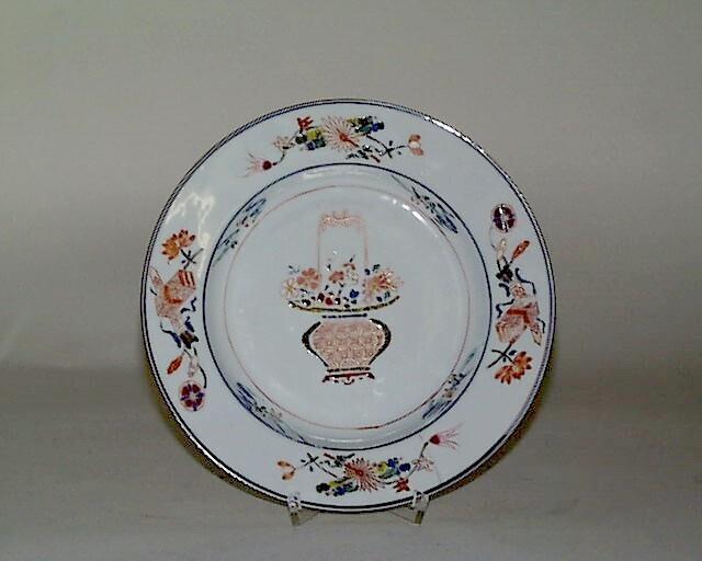 Het bord is aan de achterkant voorzien van een afgeschuinde standring en versierd met bloeiende takken in onderglazuur roodbruin. Aan de voorkant is in het plat een hengselmand met bloemen en een strik afgebeeld, omgeven door een band van gestileerde florale motieven in de vertreding. De rand is versierd met kostbaarheden met bloemen, en heeft een kapucijner lip. (Nederlands)