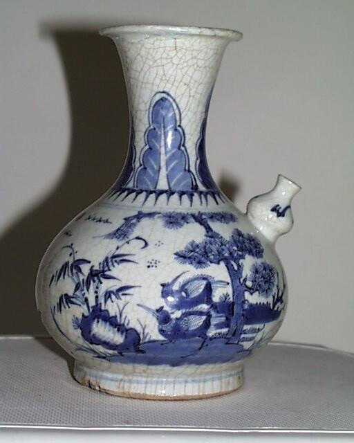 Decor in blauw onderglazuur van dennenboom, riet, bloeiende boom, vogels, vierpuntige bladeren langs de hals etc. (Nederlands)