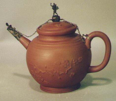 De theepot is bolvormig en heeft een conische voet met standring, een korte concave hals, een rechte tuit, een ovaal oor en een gewelfd deksel. De buik heeft twee decors in reliëf van bloeiende prunustakken. Op de schouder bevinden zich twee ingekerfde banden. Het deksel is gedecoreerd met twee bloeiende prunusbloemen in reliëf. Op de dekselknop bevindt zich een applicatie met een staande man, die met twee kettinkjes verbonden is met een band om het oor en een tuitstuk met een klepdekseltje. (Nederlands)