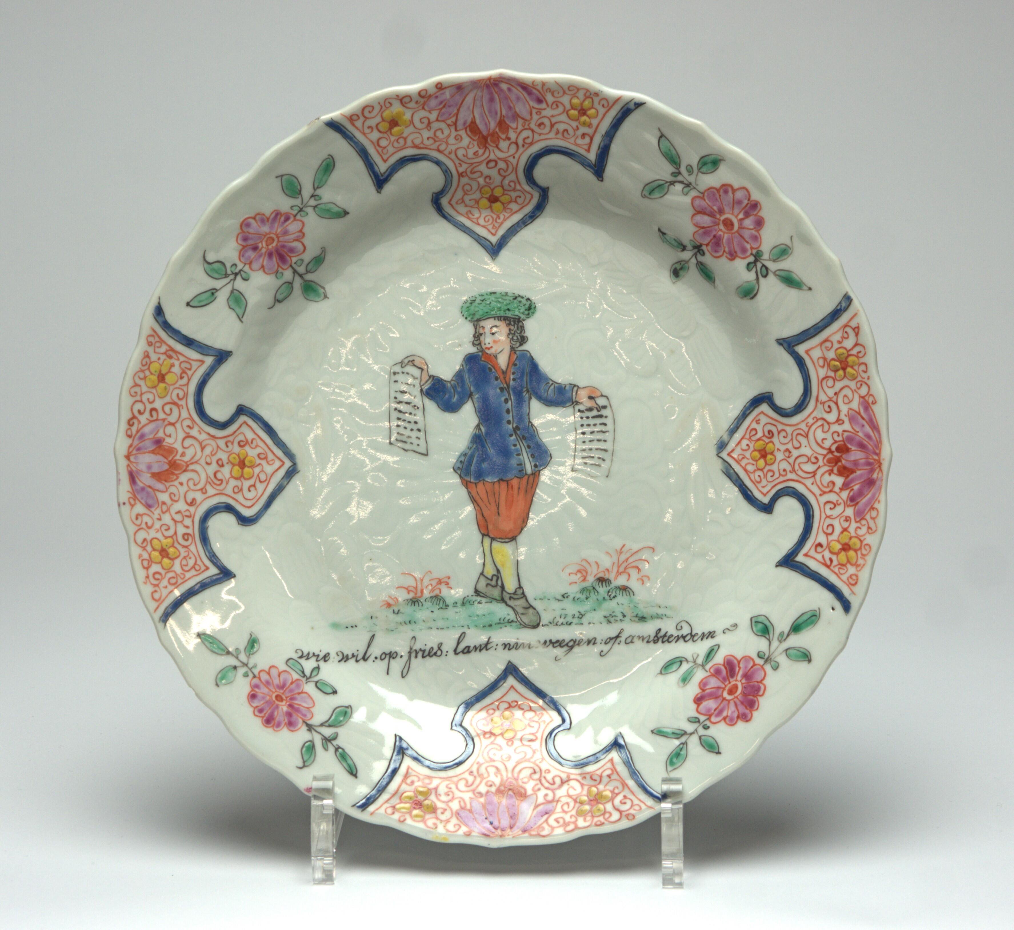 rond, gegolfde rand, standring, licht reliëfpatroon van bloemen en ranken onder het glazuur, op de rand vier evenredig verdeelde wolkenmotieven, afgewisseld met floraal ornament, op het plat een half naar rechts gewende staande man met groene bontmuts, blauwe jas en roodbruine pofbroek, in beide handen houdt hij een aandeel, onderschrift: 'wie:wil:op:fries:lant:ninweegen:of:amsterdam' (Nederlands)